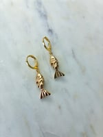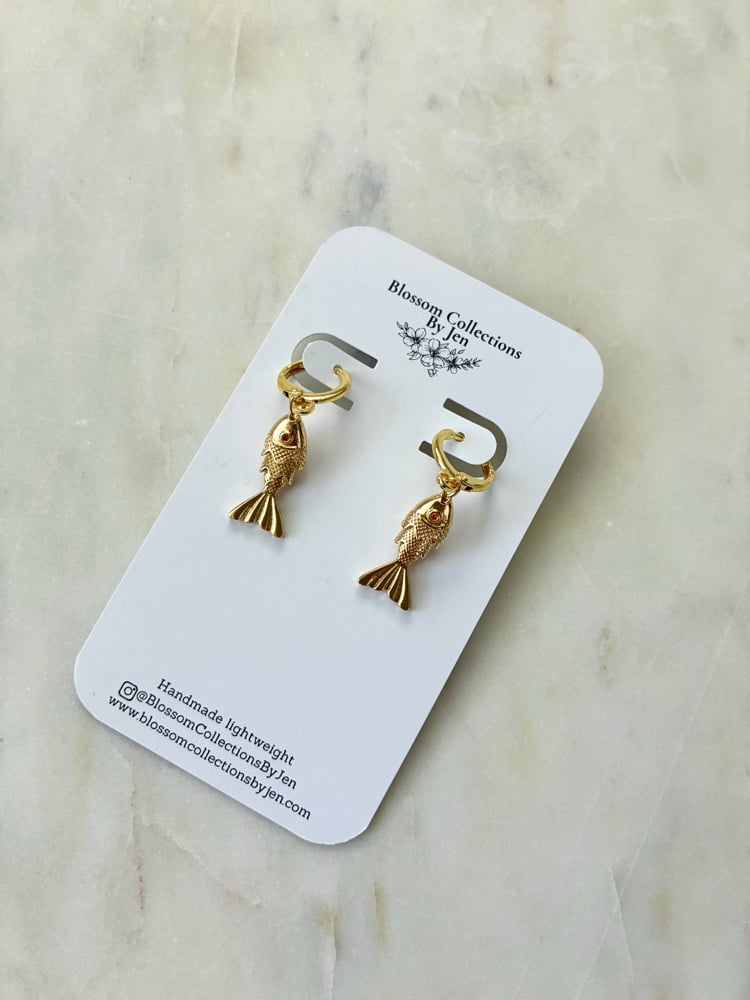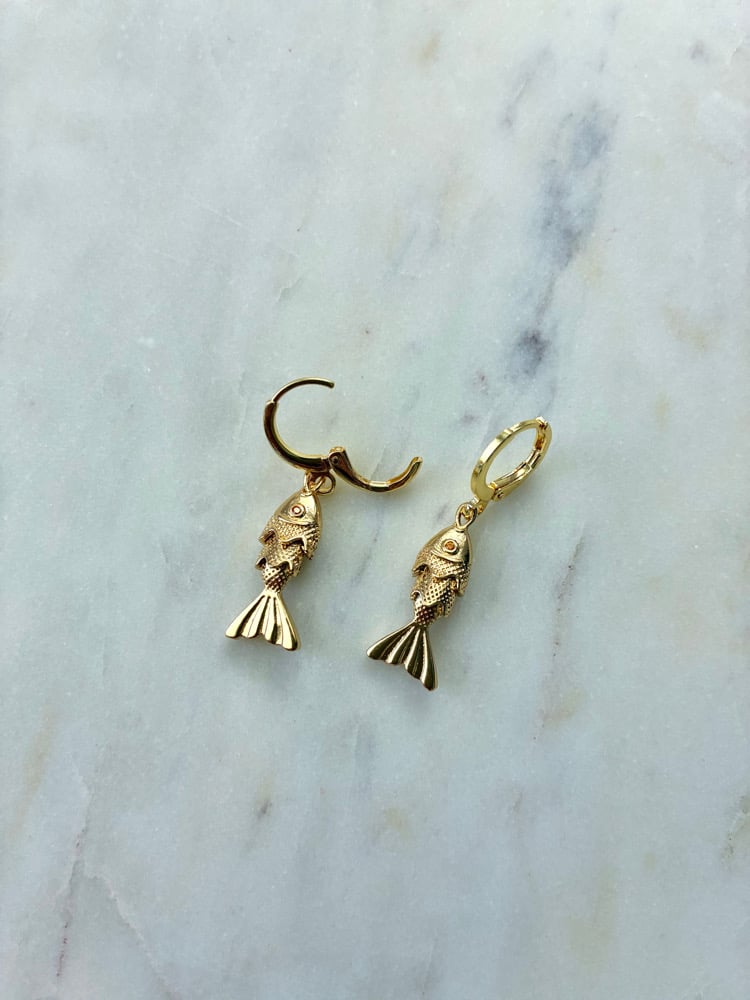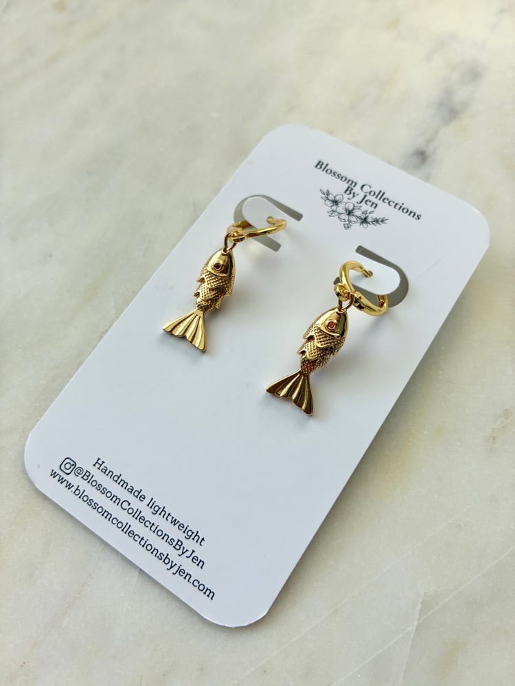 18K Gold plated brass hoop huggies with 18k gold plated fish charms.